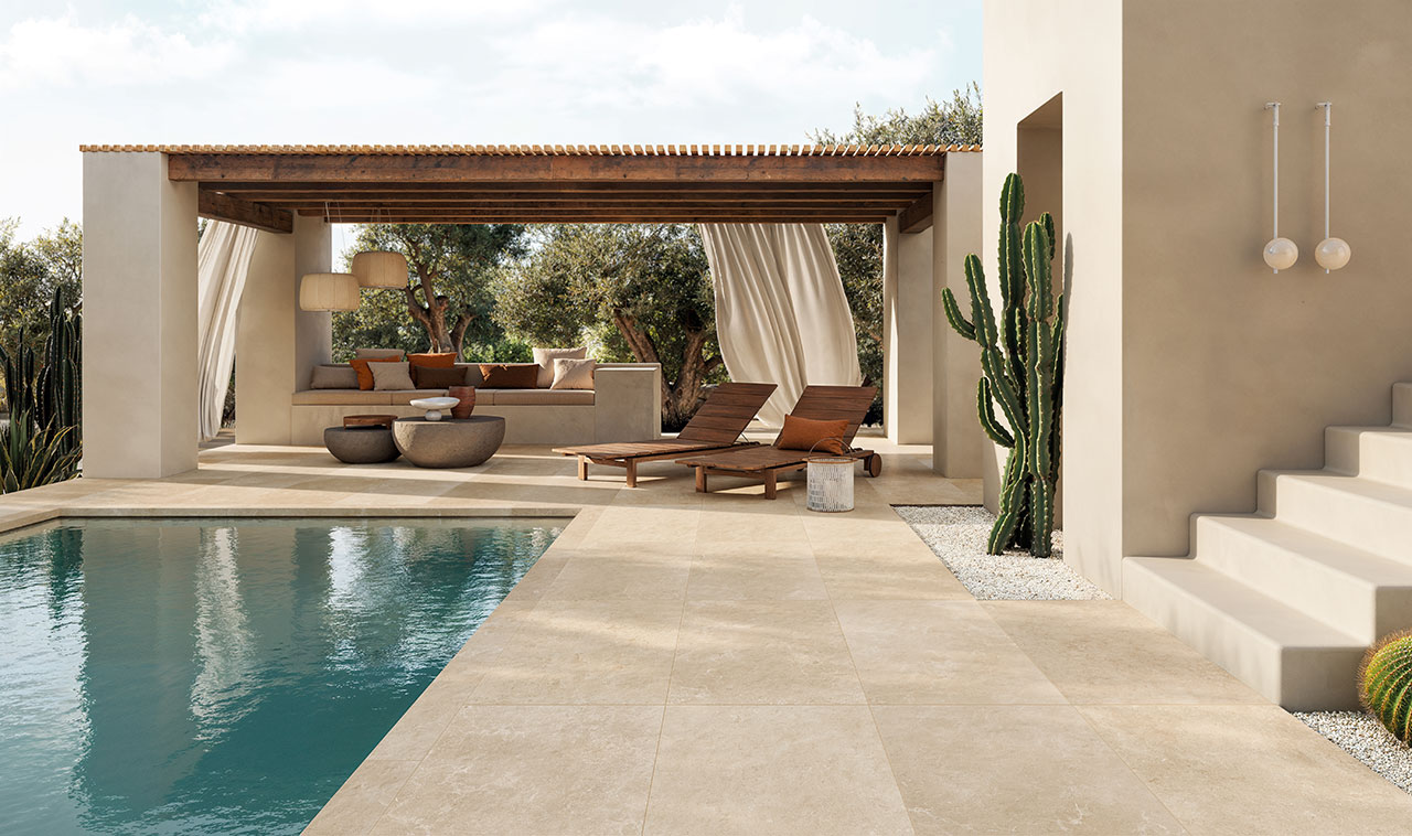Contrada Valente is inspired by Apulian stone, a key element of Mediterranean architecture. The collection, characterized by natural, unrectified surfaces, captures the raw essence of the original material, rendering it in settings of contemporary design. Detail-rich textures and delicate shades evoke the tactile and visual sensation of stone worn by time. Each large size tile is a witness to a long tradition, which lives again thanks to the finest ceramic technology.