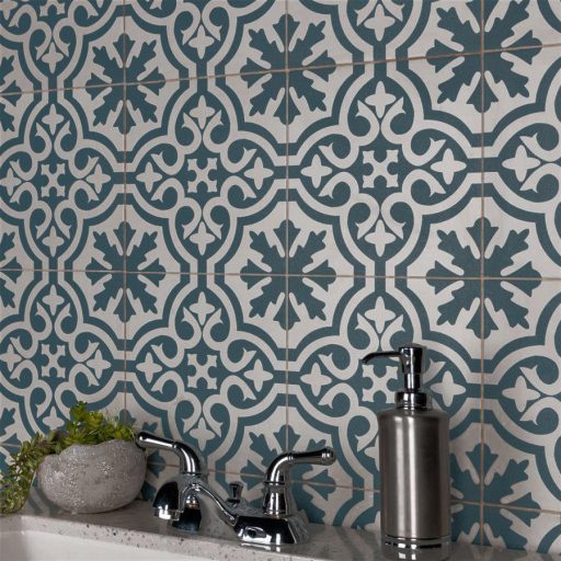 With a recognizable design, the simplistic arcs frame the snowflake inspired patterns that create continuity throughout the installation. Set on an eggshell base glaze, the deep blue design offers the ability to be used in modern and rustic settings. The scored grout lines can be grouted with the colour of your choice to further customize your installation.