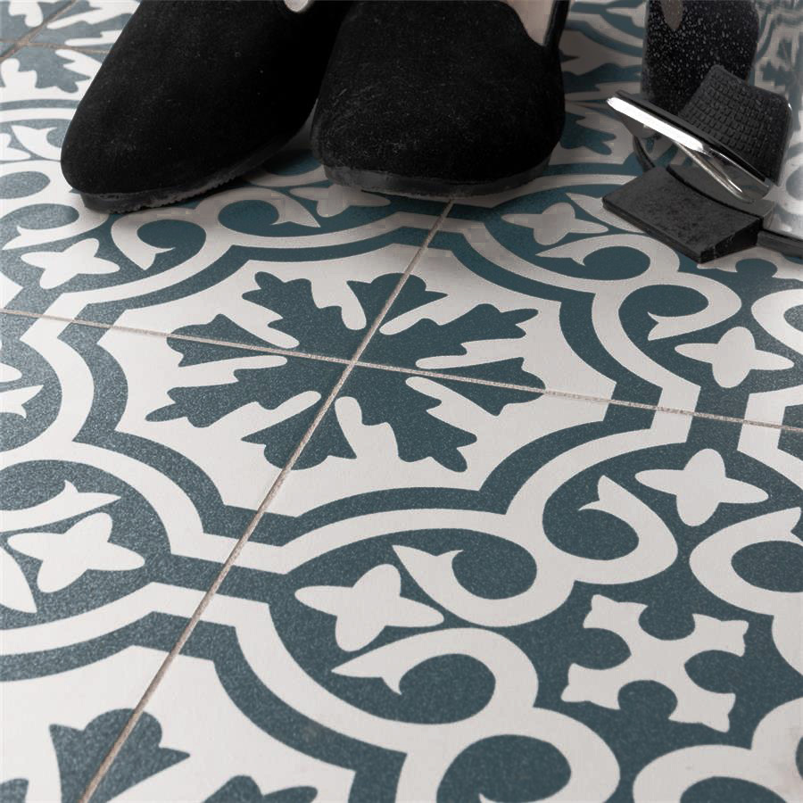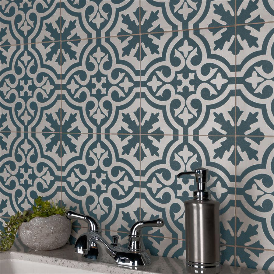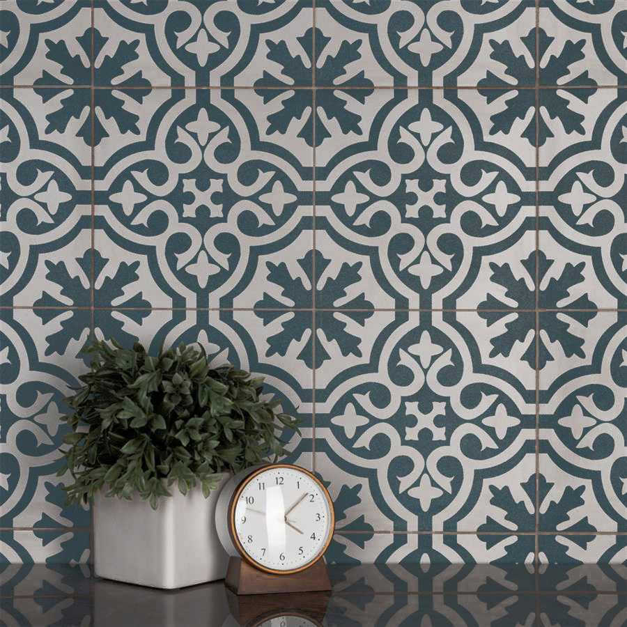 Capturing the artisanal look of cement tiles, Lily Fiore offers an encaustic, old-world design that can blend into any décor. Save time arranging smaller square tiles and instead install these durable porcelain tiles, which have four squares with scored grout lines.