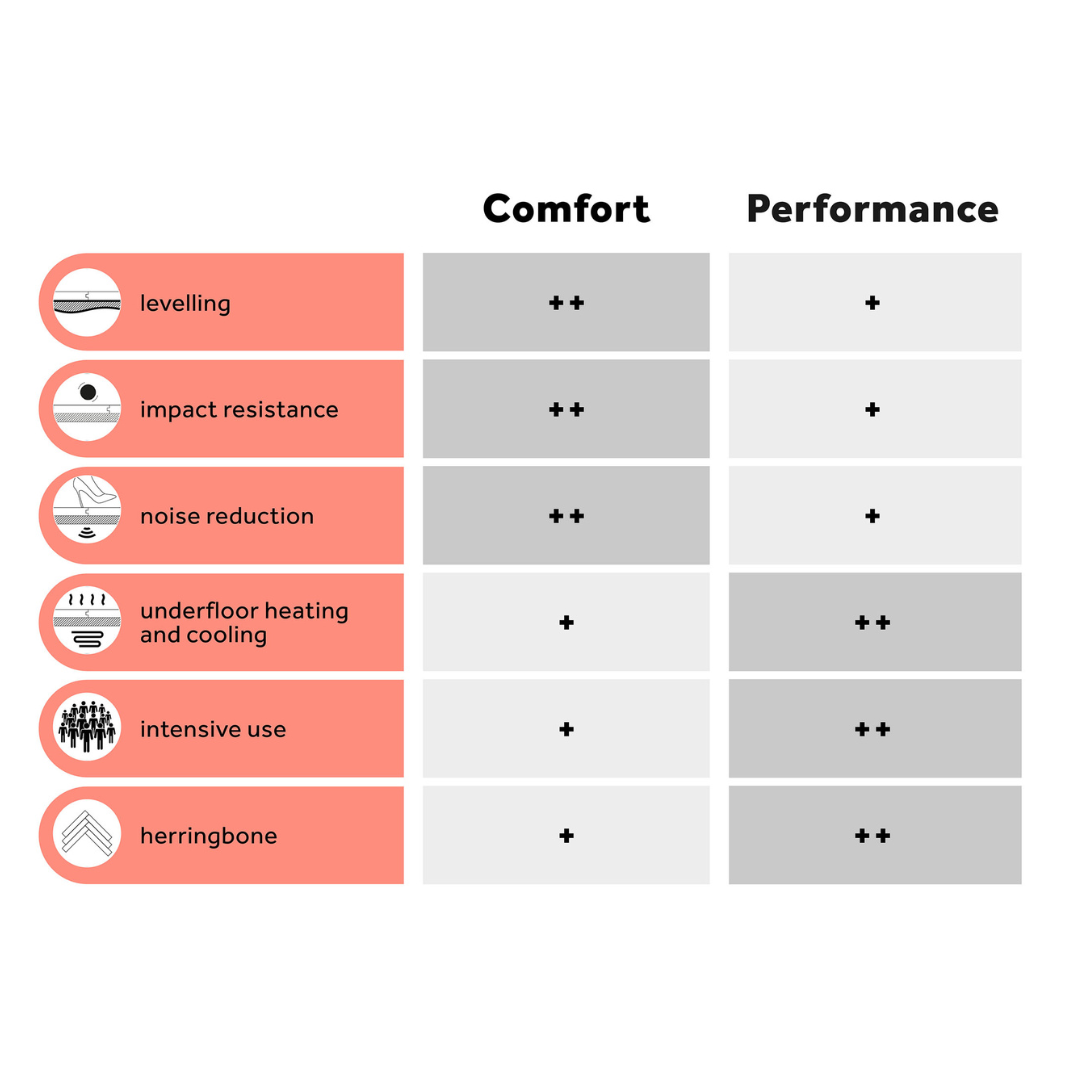 The Performance product is slightly harder, meaning it provides optimal support for your floor’s click connections. Perfect for commercial applications with intensive use, such as restaurants, shops or offices